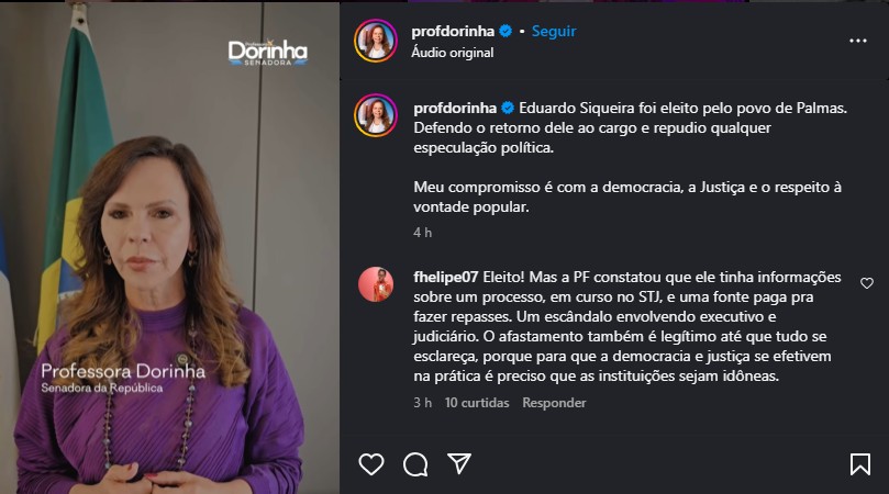A senadora Dorinha (UB) gravou um vídeo nesta quarta-feira, 9, tratando do tema e reforçando o respeito institucional ao resultado das urnas: “Gostaria de tratar de um assunto muito delicado e triste que nós estamos vivendo na nossa capital. Quem foi eleito para ser prefeito de Palmas foi Eduardo Siqueira Campos, e a ele cabe a sua competência e dedicação para cuidar da nossa cidade e cumprir todos os compromissos”.