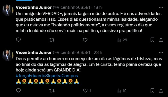Em outro momento, Vicentinho usou o tom religioso para confortar os apoiadores: “Deus permite ao homem no começo de um dia as lágrimas de tristeza, mas ao final do dia as lágrimas de alegria. Em fé cristã, tenho plena certeza que hoje ainda será um GRANDE DIA!” ForçaEduardoSiqueiraCampos 🌻🙏