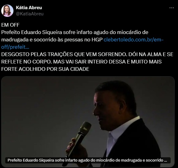 A ex-senadora Kátia Abreu também comentou publicamente a situação do prefeito, associando o agravamento de sua saúde ao cenário político que enfrenta: “Desgosto pelas traições que vem sofrendo. Dói na alma e se reflete no corpo. Mas vai sair inteiro dessa e muito mais forte, acolhido por sua cidade”.