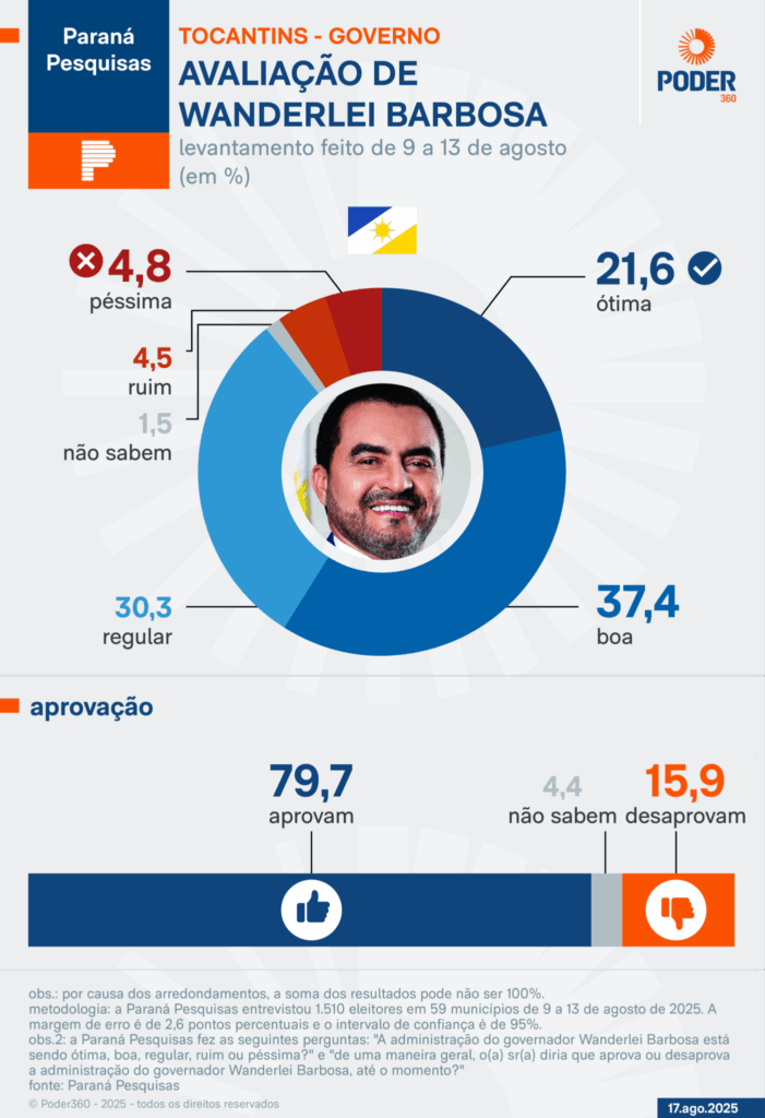 Uma pesquisa divulgada nesta segunda-feira (18) pela Paraná Pesquisas mostrou que o governador do Tocantins, Wanderlei Barbosa (Republicanos), tem 79,7% de aprovação entre os eleitores. O levantamento foi realizado entre os dias 9 e 13 de agosto em diversas regiões do Estado.