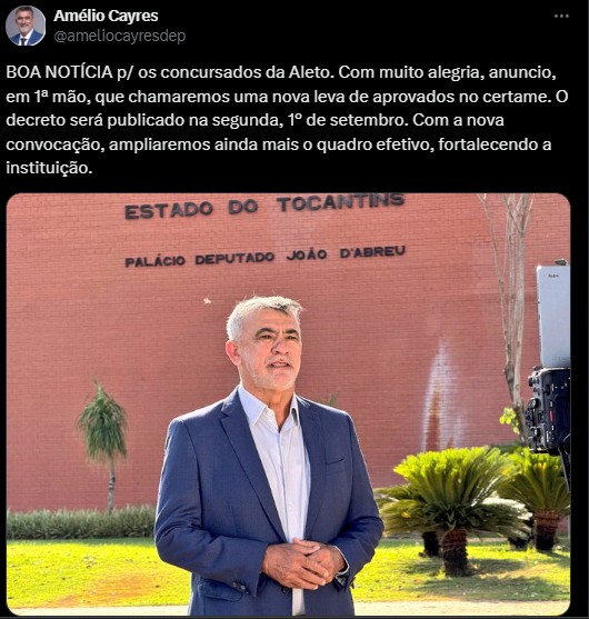 O presidente da Assembleia Legislativa do Tocantins (Aleto), deputado estadual Amélio Cayres (Republicanos), anunciou nesta terça-feira (26) que mais candidatos aprovados no concurso público da Casa de Leis serão convocados. Segundo o parlamentar, a publicação oficial do decreto está prevista para a próxima segunda-feira, 1º de setembro.