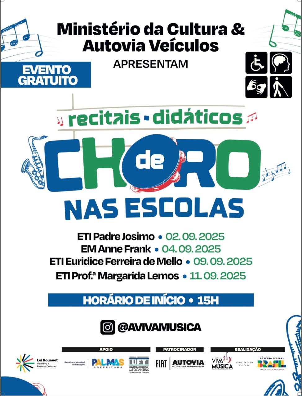 A cidade de Palmas será palco de uma temporada especial dedicada ao choro, gênero musical considerado patrimônio cultural brasileiro. O projeto “Recitais Didáticos de Choro nas Escolas”, promovido pela Associação Viva Música, levará música e conhecimento a estudantes da rede pública. O patrocínio é da Lei Rouanet, via empresa Autovia Fiat e apoio da Secretaria Municipal de Educação.