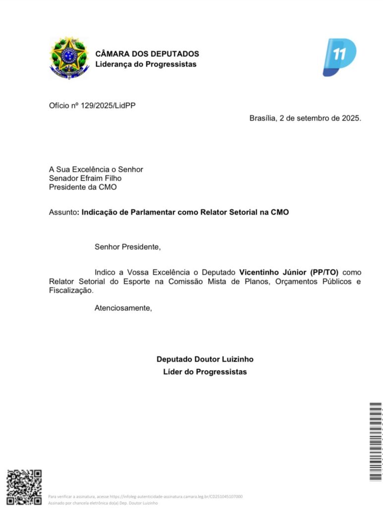 O deputado federal Vicentinho Júnior (PP-TO) foi indicado pela Federação União Progressista como relator setorial do Ministério do Esporte para trabalhar no texto da Lei Orçamentária Anual (LOA) de 2026. A indicação, vista como um reconhecimento de seu trabalho, confere ao parlamentar tocantinense a responsabilidade de analisar e propor ajustes no orçamento federal destinado ao setor esportivo.