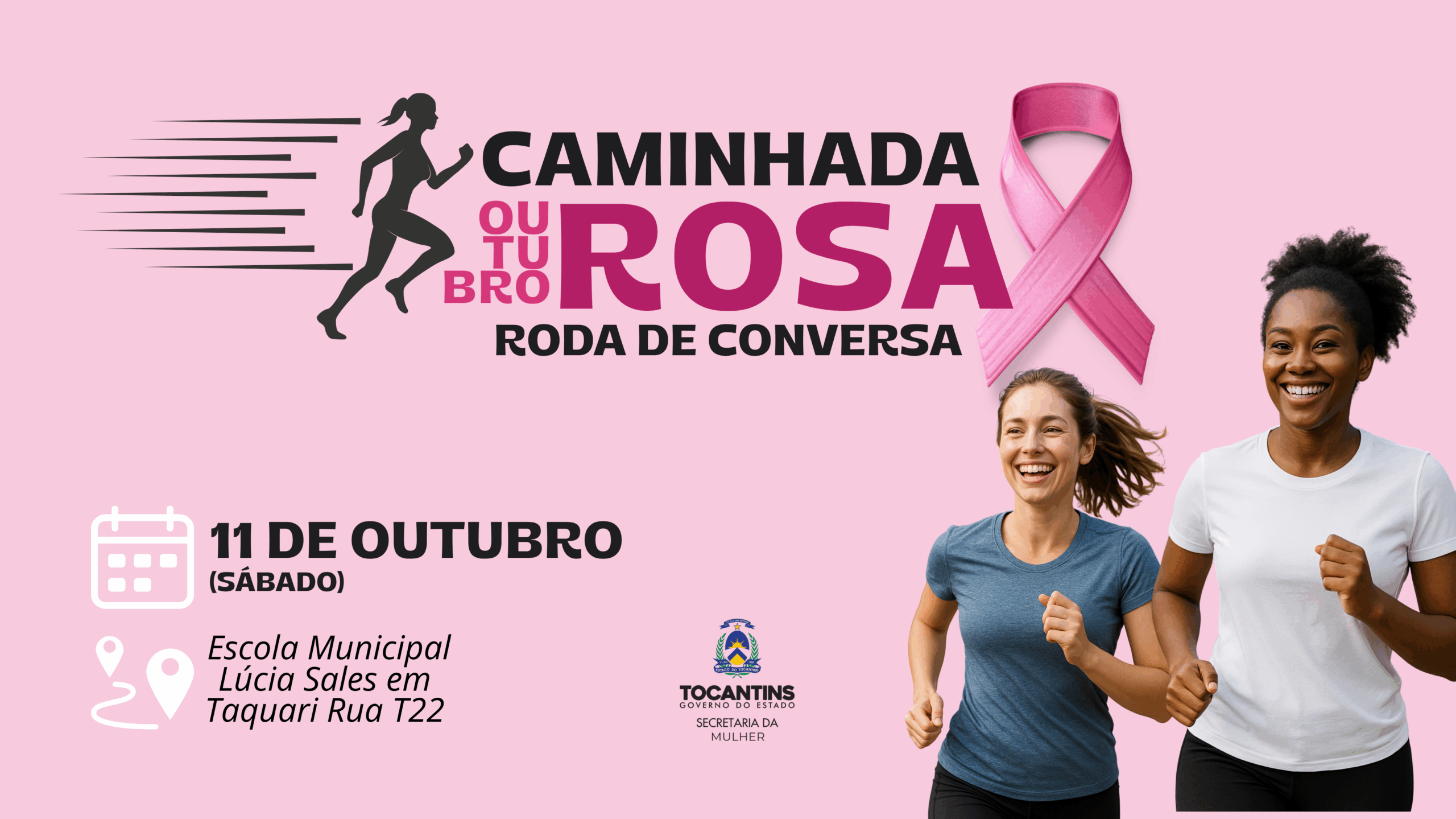A Secretaria de Estado da Mulher (SecMulher), realiza neste sábado, 11, uma manhã de atividades voltadas à conscientização sobre a saúde da mulher, dentro da programação da campanha Outubro Rosa. A ação será realizada na Escola Municipal Lúcia Sales, no setor Taquari, em Palmas, com início previsto para as 6 horas.