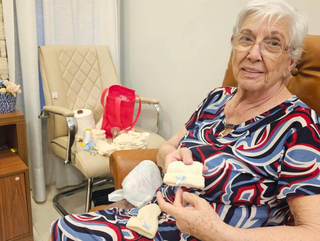Um item de extrema importância para o cuidado dos bebês, que ao nascerem perdem calor, principalmente pela cabeça. Assim são as toucas que ajudam a regular a temperatura. No Hospital e Maternidade Dona Regina Siqueira Campos (HMDR), o acessório é distribuído e conta com a ajuda de uma voluntária especial, a idosa Karine Rady Nardini, bisavó de quatro, de 80 anos, que decidiu fazer toucas.