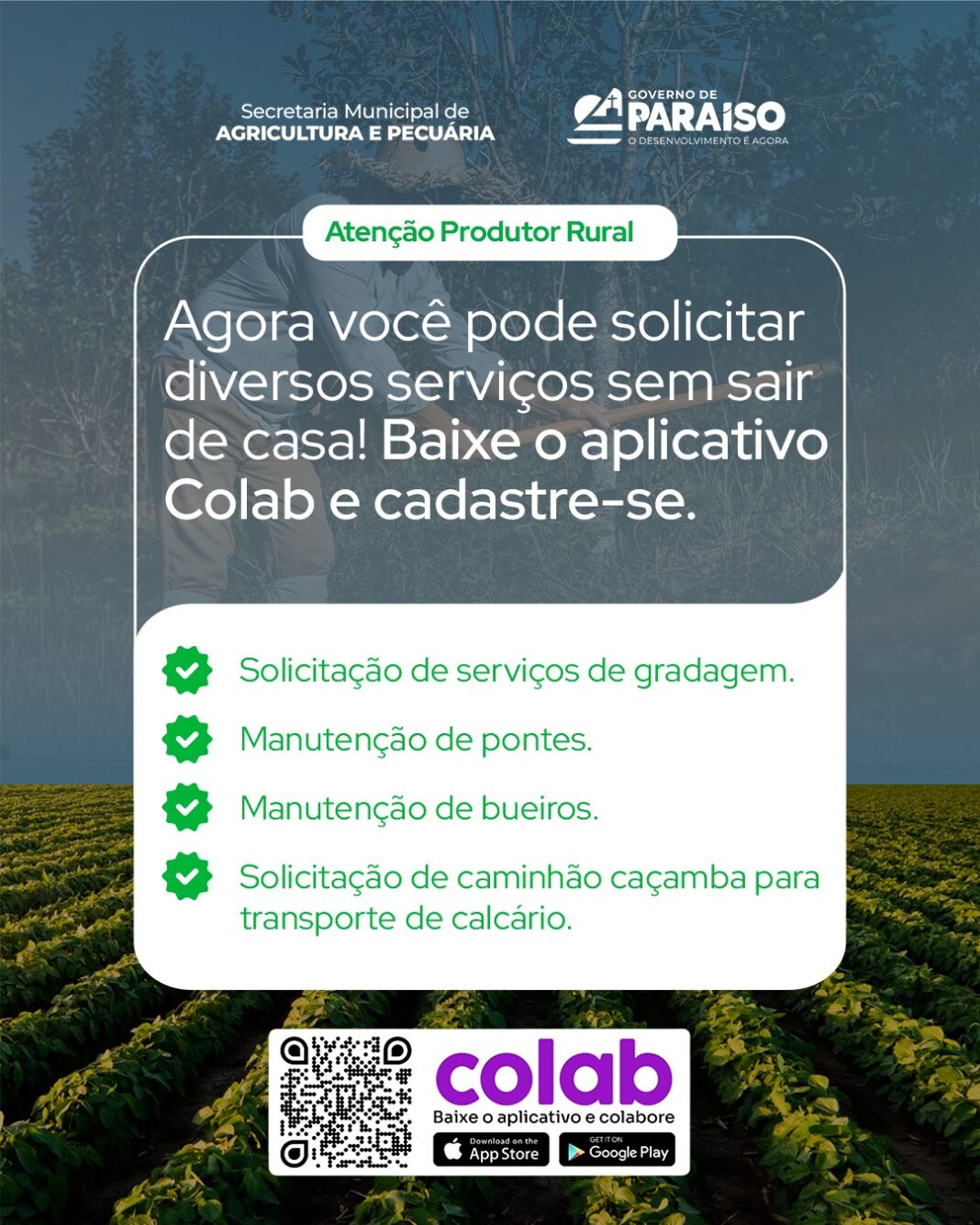 Os produtores rurais de Paraíso do Tocantins passam a contar com uma nova forma de solicitar serviços essenciais da Secretaria Municipal de Agricultura e Pecuária (Seape). A partir de agora, pedidos de gradagem, manutenção de pontes e bueiros, além da solicitação de caminhão caçamba para transporte de calcário, poderão ser feitos diretamente pelo Colab, sem necessidade de deslocamento até a sede da pasta.