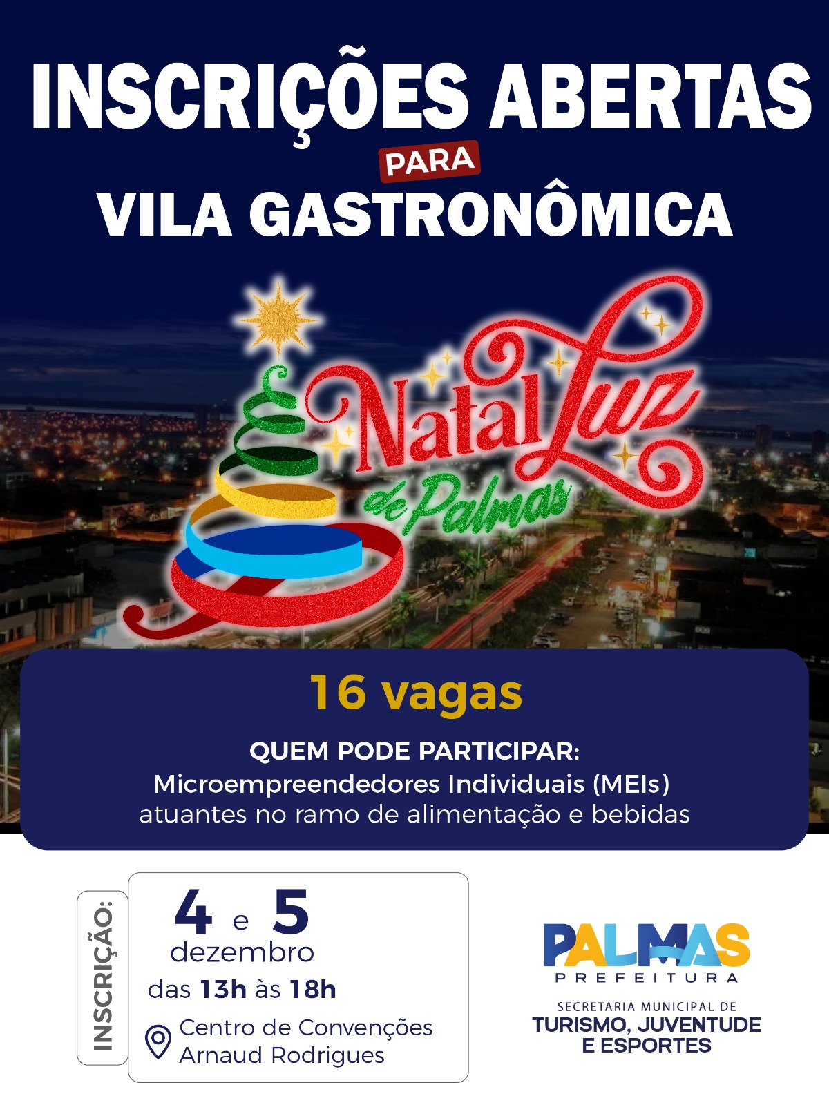 A Prefeitura de Palmas, por meio da Secretaria Municipal de Turismo, Juventude e Esportes, inicia nesta quinta-feira, 4, o período de inscrições para microempreendedores interessados em participar da Vila Gastronômica do Natal Luz de Palmas, que ocorrerá no Parque Cesamar. O edital de seleção foi publicado no Diário Oficial do Município desta quarta-feira, 3.