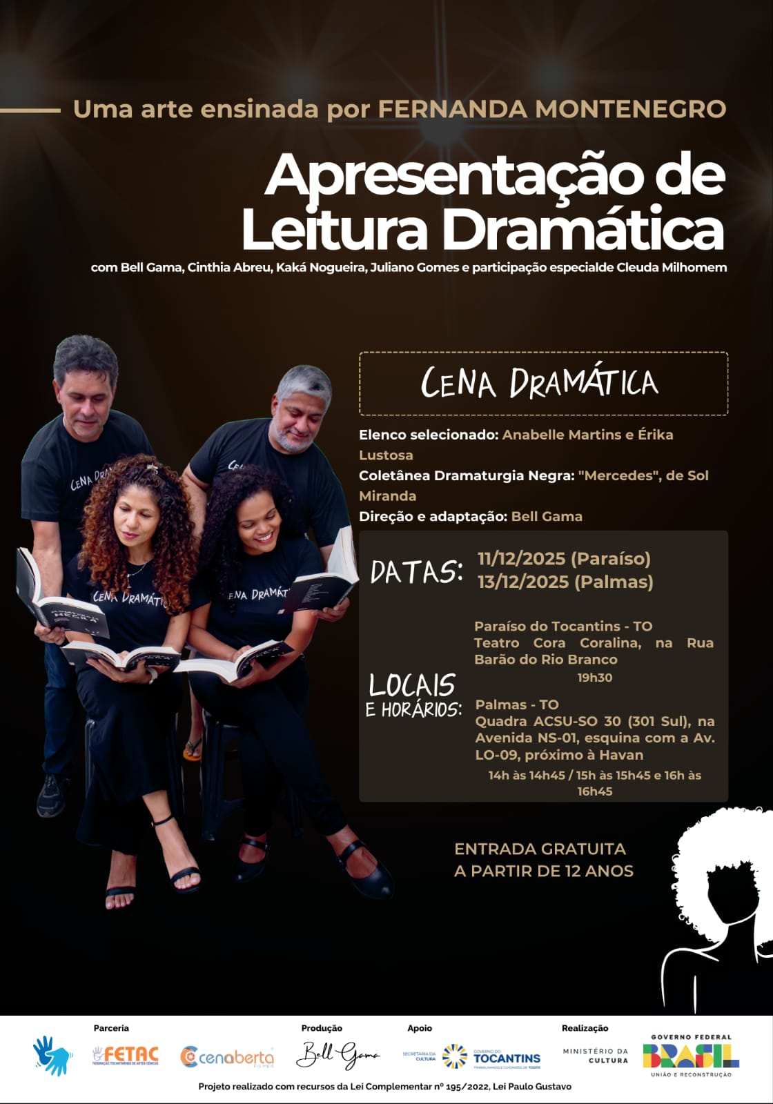 O projeto Leitura Dramática – Cena Dramática é realizado pela atriz Bell Gama, com recursos da Lei Paulo Gustavo (LPG), por meio do Ministério da Cultura e da Secretaria Estadual da Cultura do Tocantins, reafirmando o compromisso com a formação cultural, a valorização da memória artística e o acesso democrático à cultura.