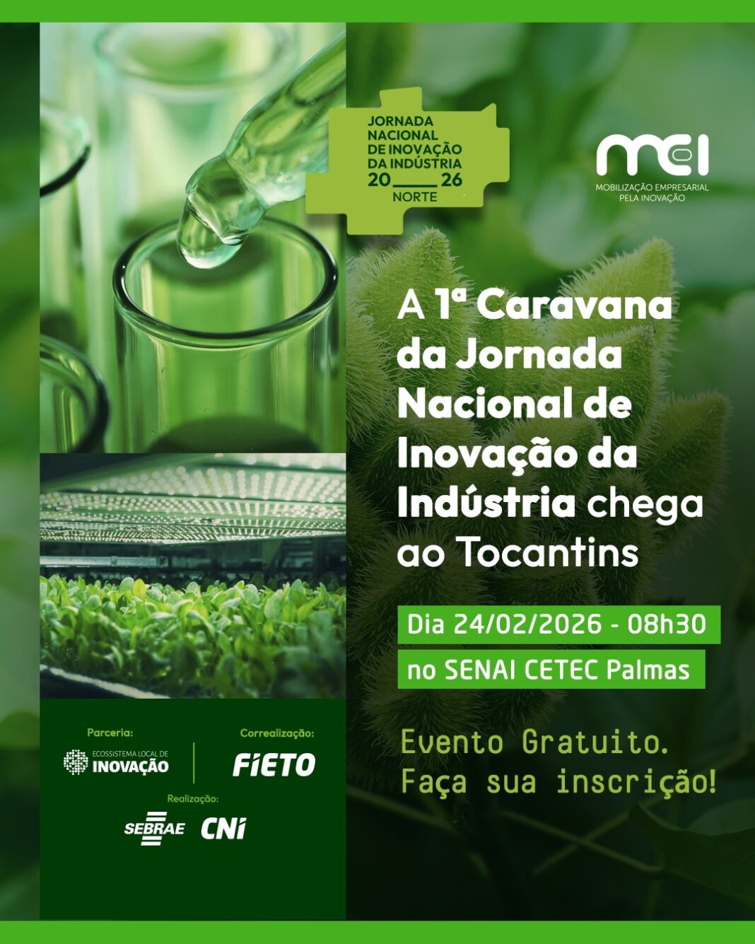 Estão abertas as inscrições para a Jornada Nacional de Inovação da Indústria no Tocantins, que será realizada no dia 24 de fevereiro, em Palmas, no Centro de Educação e Tecnologia (CETEC) do SENAI. A iniciativa, promovida pela Confederação Nacional da Indústria (CNI) e pelo Serviço Brasileiro de Apoio às Micro e Pequenas Empresas (Sebrae), percorre todo o país para mapear desafios, propostas e soluções inovadoras voltadas ao futuro da indústria brasileira.