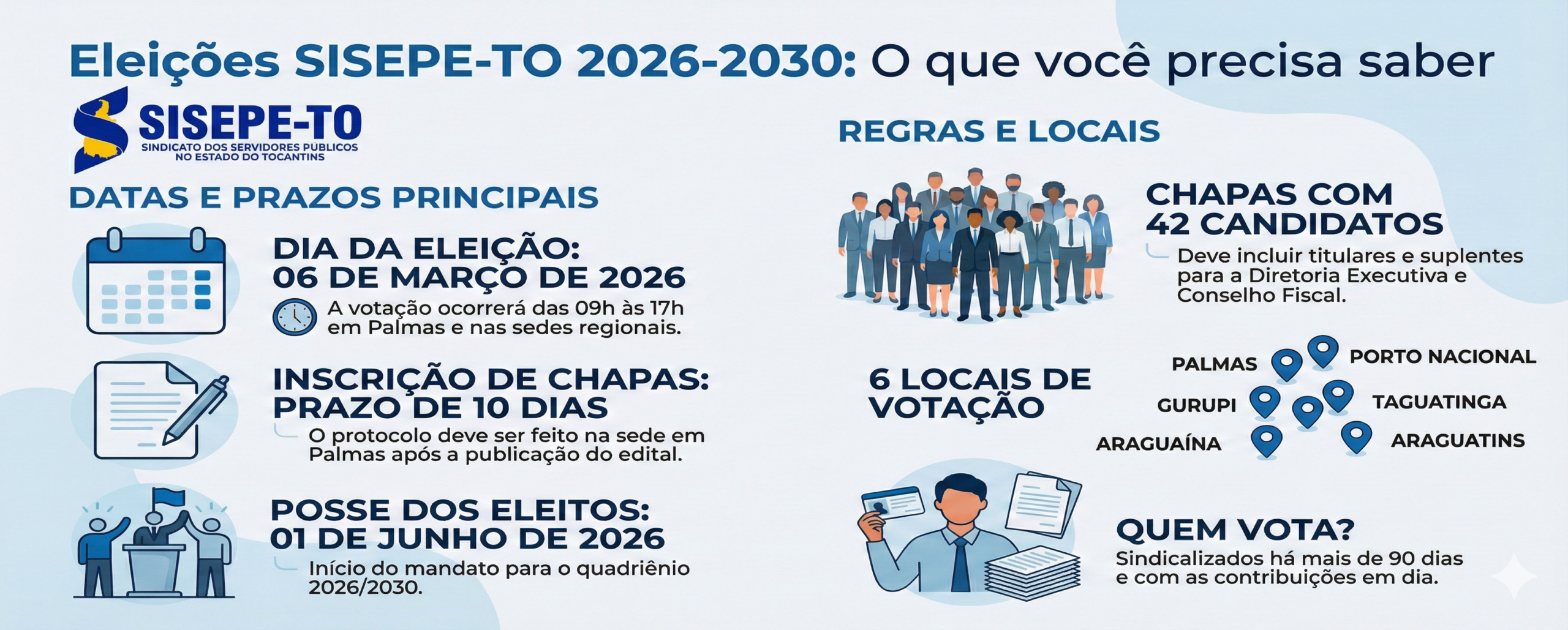 A Comissão Eleitoral do Sisepe-TO (Sindicato dos Servidores Públicos no Estado do Tocantins) oficializou a abertura do processo sucessório da entidade com a publicação do edital de convocação no Diário Oficial do Estado desta sexta-feira, 30 de janeiro. O documento define as regras para as Eleições Gerais do quadriênio 2026/2030, marcando a votação para o dia 6 de março de 2026 e convocando os servidores estaduais aptos a participarem da escolha da nova diretoria.
