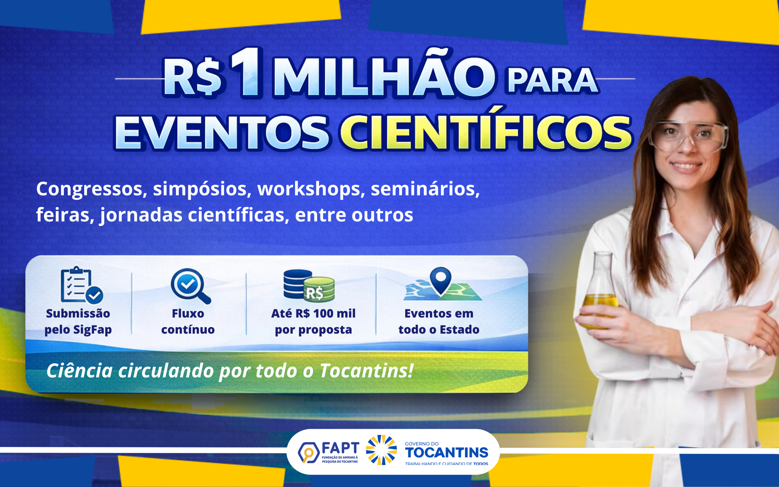 O Governo do Tocantins, por meio da Fundação de Amparo à Pesquisa do Tocantins (Fapt), publicou o Edital nº 01/2026, que vai apoiar financeiramente a realização de eventos técnico-científicos no estado ao longo de todo o ano de 2026. A chamada, em fluxo contínuo, destina R$ 1 milhão para viabilizar congressos, simpósios, workshops, seminários, feiras, jornadas científicas e outras iniciativas voltadas à divulgação e ao fortalecimento da Ciência, Tecnologia e Inovação (CT&I).