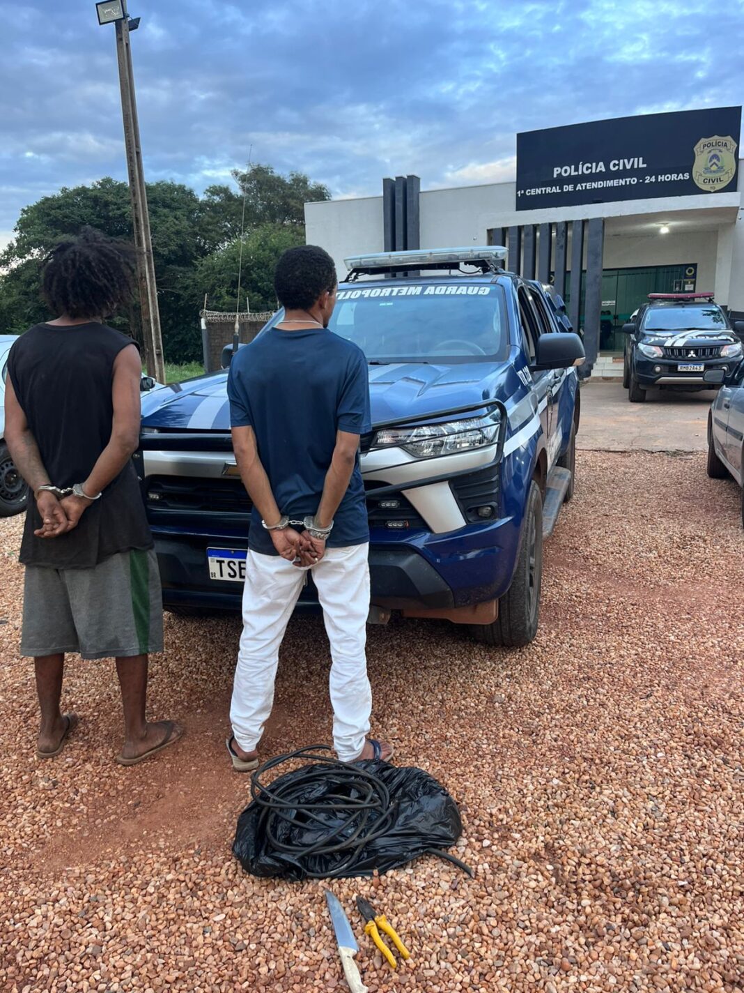 A Guarda Metropolitana de Palmas (GMP) prendeu, na tarde desta terça-feira, 24, dois suspeitos de furtar fios do sistema de iluminação pública na nova via do Acesso Norte, região central da Capital. A ocorrência foi registrada em frente ao prédio do Tribunal Regional Eleitoral do Tocantins (TRE), na quadra 103 Norte. A obra é executada por meio da Secretaria de Infraestrutura e Habitação de Palmas e integra o projeto de requalificação da infraestrutura urbana da região.
