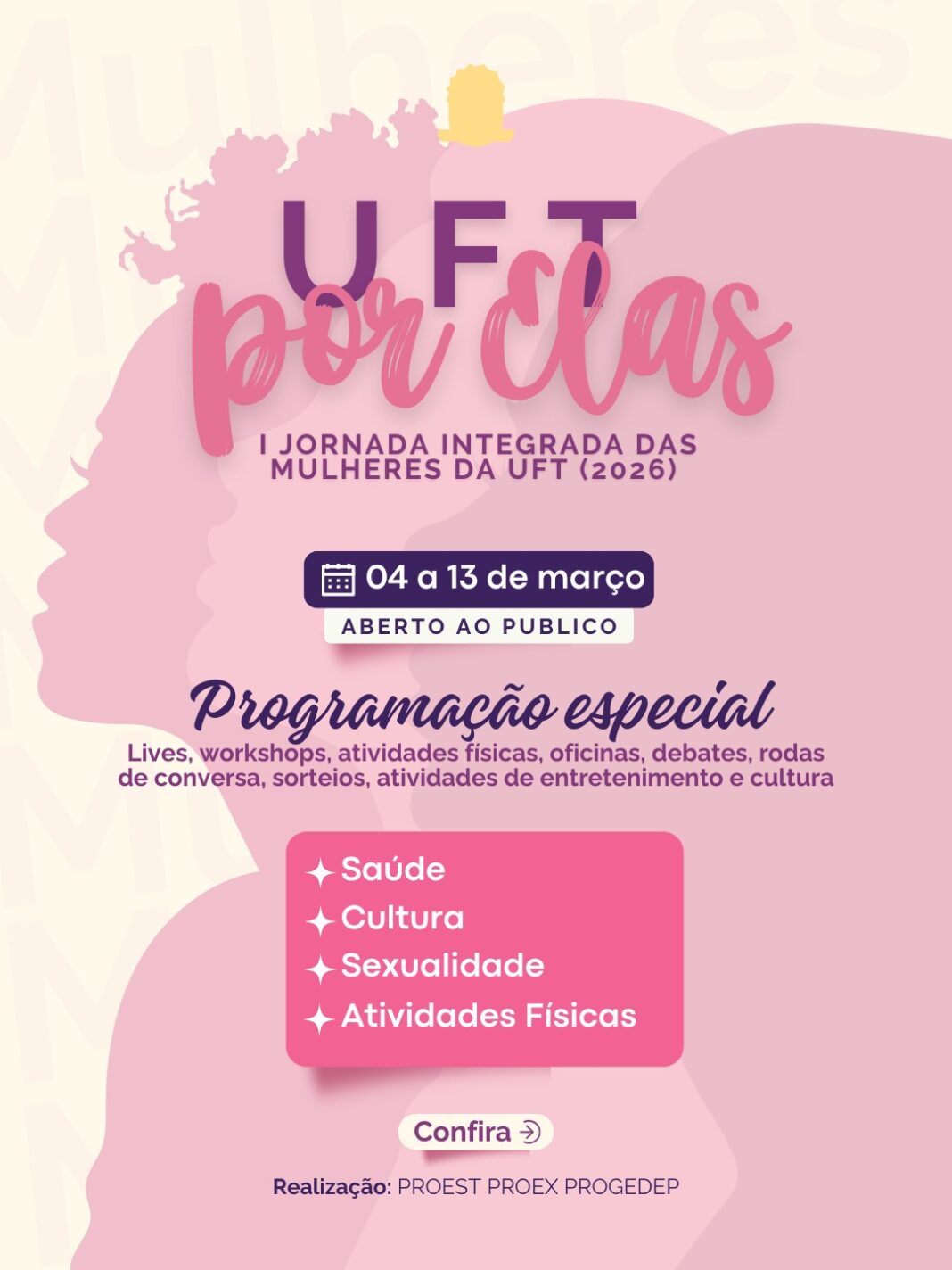 A iniciativa é organizada pela Pró-Reitoria de Assuntos Estudantis (Proest), Pró-Reitoria de Extensão, Cultura e Assuntos Comunitários (Proex) e Pró-Reitoria de Gestão e Desenvolvimento de Pessoas (Progedep), reforçando o compromisso institucional com a promoção da equidade de gênero, do bem-estar e da qualidade de vida no ambiente universitário.