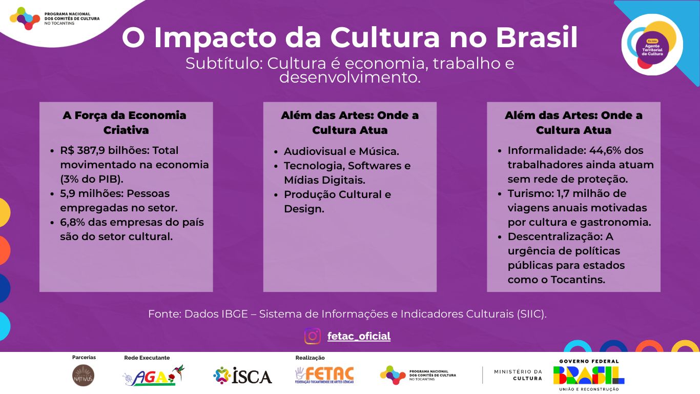 O Comitê de Cultura no Tocantins destaca a importância dos dados apresentados pelo Instituto Brasileiro de Geografia e Estatística (IBGE) durante a 5ª edição dos Diálogos SNIIC, promovida pelo Ministério da Cultura (MinC). Segundo o levantamento mais recente do Sistema de Informações e Indicadores Culturais (SIIC), a cultura brasileira emprega atualmente cerca de 5,9 milhões de pessoas e movimenta R$ 387,9 bilhões em valor adicionado à economia — o equivalente a aproximadamente 3% do Produto Interno Bruto (PIB).