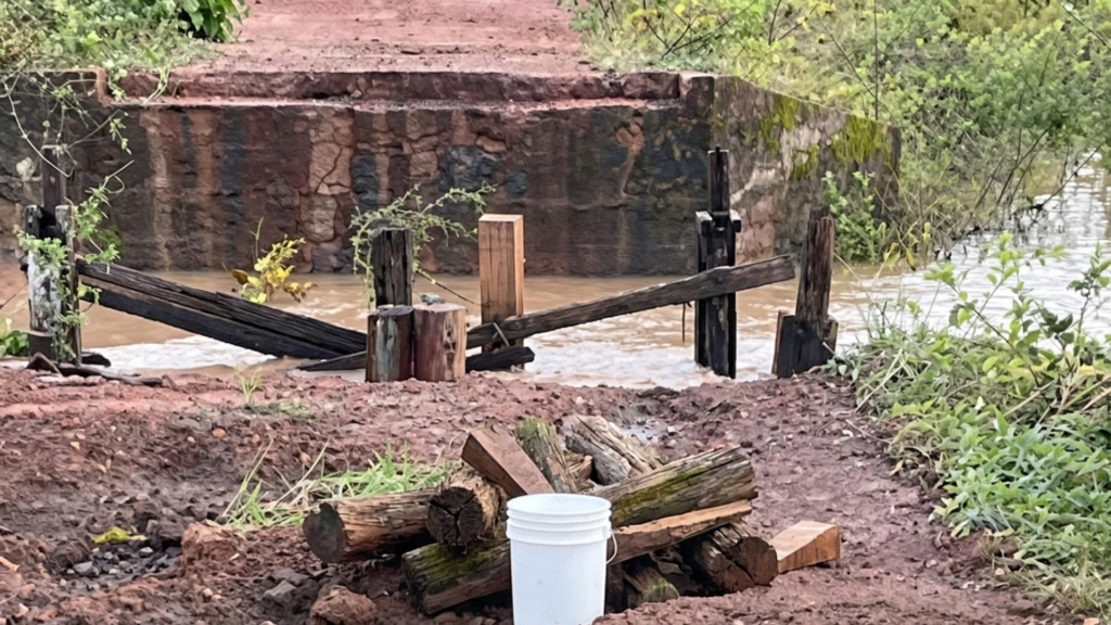Chuvas intensas destruíram estradas e pontes, deixando comunidades rurais isoladas e comprometendo acesso à escola, saúde e produção agrícola