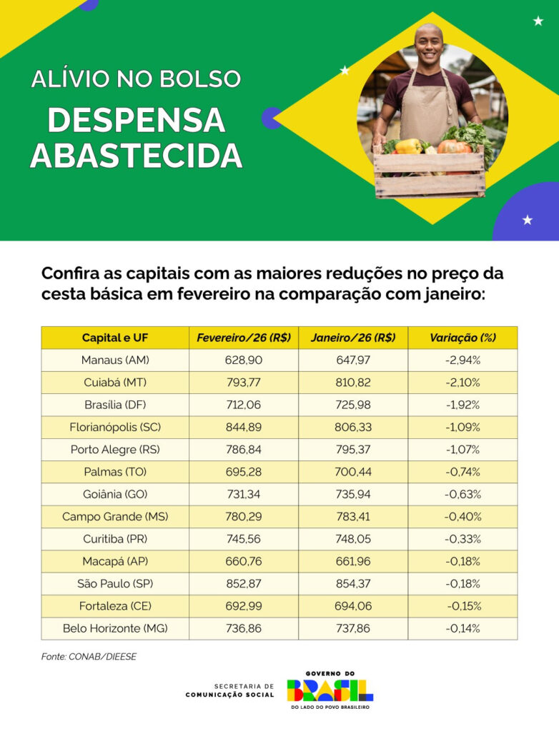 Considerando o salário mínimo líquido, após o desconto de 7,5% da Previdência Social, o comprometimento da renda com a compra da cesta básica caiu para 46,37% em fevereiro de 2026, frente a 46,71% em janeiro de 2026. O resultado indica que o trabalhador tocantinense passou a comprar mais alimentos básicos gastando uma parcela menor do salário. (Fonte: Secom/PR)