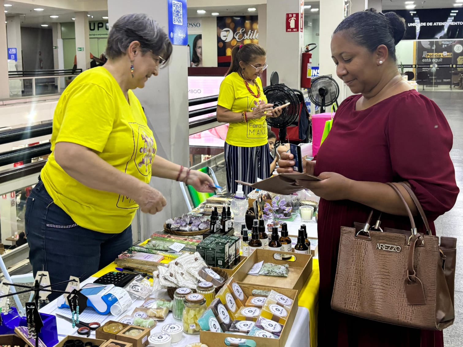 Como parte da programação especial, o shopping abriu espaço para duas feiras que reúnem iniciativas lideradas por mulheres. A primeira delas é a Feira das Manas, que reúne expositoras com trabalhos de artesanato e produtos autorais, valorizando a criatividade e a produção feminina local.