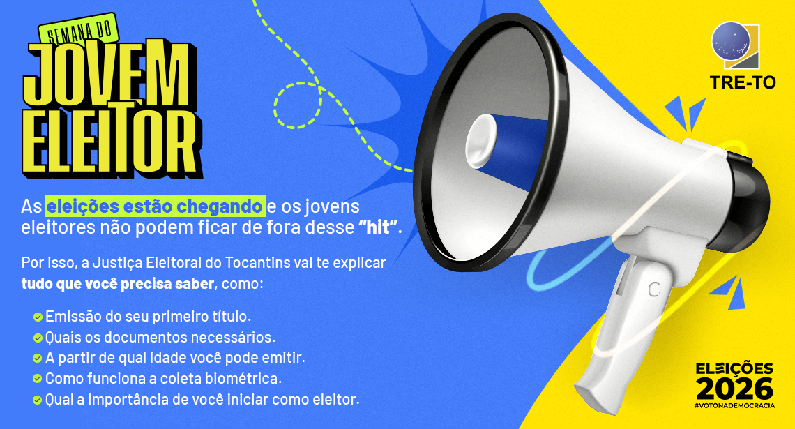 A Semana do Jovem Eleitor vai trazer uma série de conteúdos, no site e nas redes sociais do Tribunal Regional Eleitoral do Tocantins (TRE-TO), com informações sobre o primeiro título, a importância da participação ativa na democracia, entre outros assuntos para que os jovens fiquem por dentro de tudo que envolve o processo eleitoral.