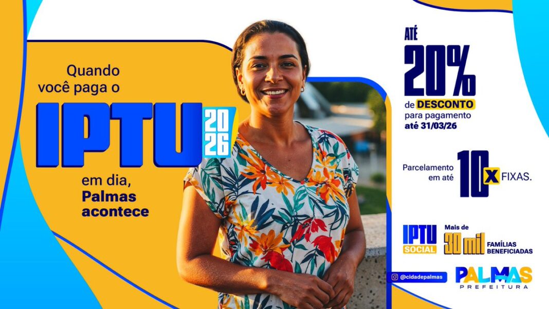 Esta terça-feira, 31, é o último dia para realizar o pagamento à vista e com desconto do Imposto Predial e Territorial Urbano (IPTU) de Palmas. O contribuinte que escolher essa opção de pagamento, poderá garantir até 20% de desconto, acumulando outros 10% pela adimplência com o Município. Os boletos foram entregues nos endereços fiscais dos palmenses, mas também podem ser acessados clicando aqui.
