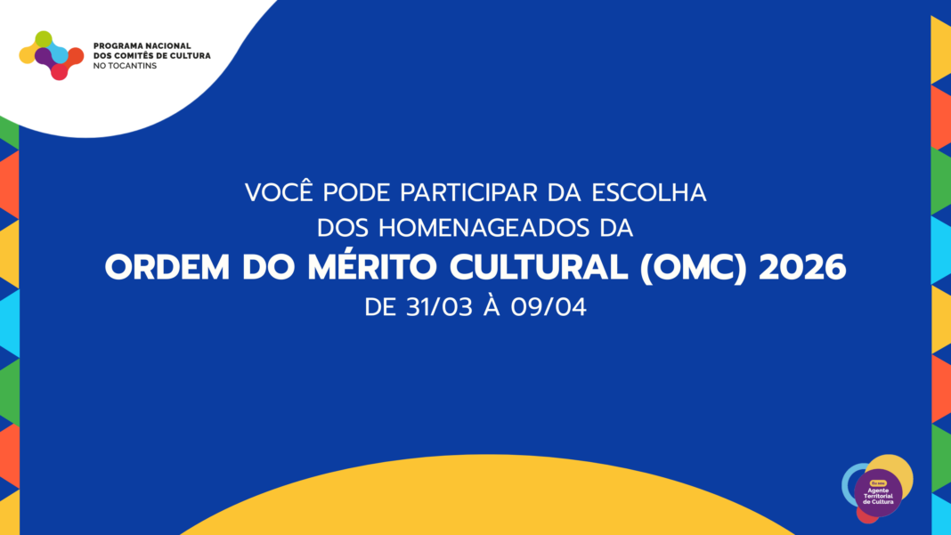 O Comitê de Cultura do Tocantins convida a sociedade a participar da escolha dos homenageados da Ordem do Mérito Cultural (OMC) 2026. Esta é a maior honraria pública concedida ao setor cultural pelo Governo do Brasil, em parceria com o Ministério da Cultura (MinC).