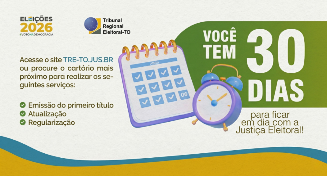 Faltam apenas 30 dias para o fechamento do cadastro eleitoral, e a Justiça Eleitoral do Tocantins faz um alerta importante às eleitoras e aos eleitores. Até o dia 6 de maio, ainda é possível tirar o título de eleitor, atualizar dados, transferir o domicílio eleitoral ou regularizar pendências para participar das Eleições Gerais de 2026.