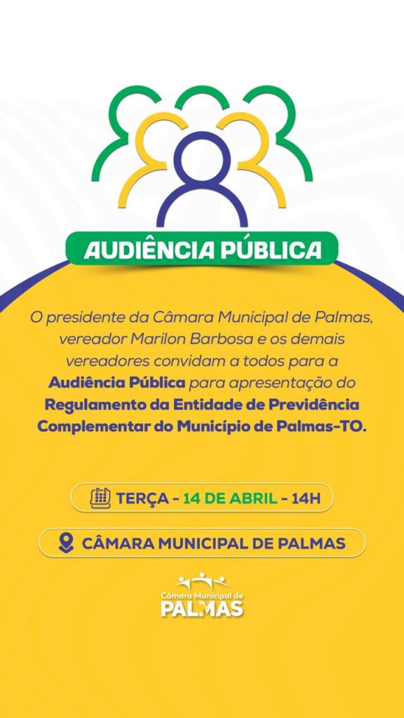 A Câmara Municipal de Palmas (CMP), por meio da Comissão de Constituição, Justiça e Redação, realizará nesta terça-feira (14) audiência pública para apresentação do regulamento da entidade de previdência complementar de Palmas. A apresentação, que será conduzida por representantes do Previpalmas em parceria com o Banco do Brasil, está prevista para às 14h, no plenário da Casa de Leis e será aberta à participação da população.