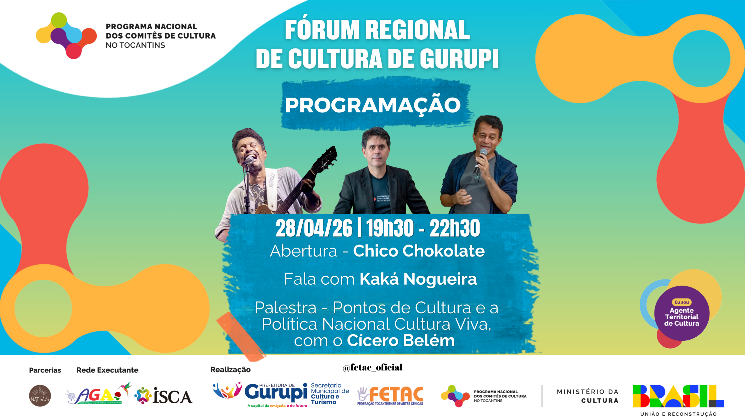 O Comitê de Cultura no Tocantins realiza, nesta terça e quarta-feira, 28 e 29, o Fórum Regional de Cultura de Gurupi, em parceria com a Secretaria Municipal de Cultura de Gurupi, reunindo artistas, produtores culturais, fazedores de cultura, gestores públicos e a comunidade em geral para dois dias de debates, apresentações artísticas e construção coletiva em torno do fortalecimento das políticas públicas culturais no município.