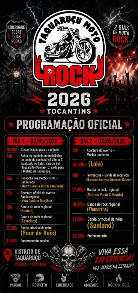 Com o apoio da Prefeitura de Palmas, por meio da Secretaria Municipal de Turismo, e com recursos de emenda do deputado federal Vicentinho Júnior, o distrito de Taquaruçu recebe, neste fim de semana, 2 e 3 de maio, o evento Taquaruçu Moto Rock. A iniciativa reúne atrações culturais, musicais e gastronômicas, com o objetivo de movimentar o turismo local e fomentar a economia do distrito.